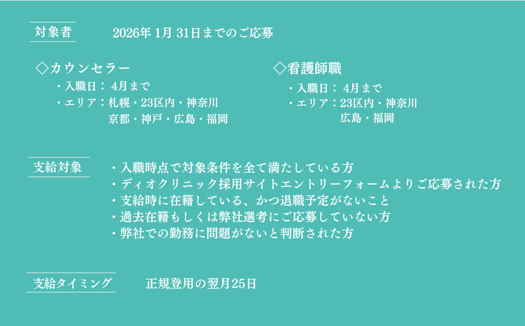 ディオクリニックの拡大と採用強化を背景に、ご入社された方にお祝い金キャンペーンを開催しております。